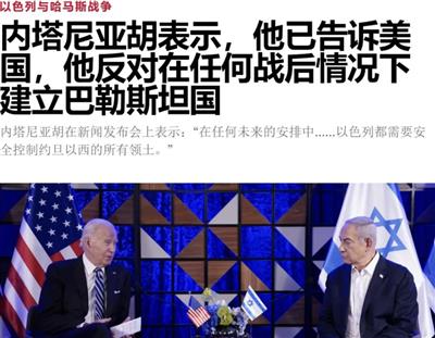 据美国的媒体“政客(politico)网”报道,以色列总理本杰明·内塔尼亚胡1月18日公开表态,他已经拒绝了美国的要求,他反对任何想要在战后建立巴勒斯坦国的建议,以色列有权力对任何国家说“不行”。