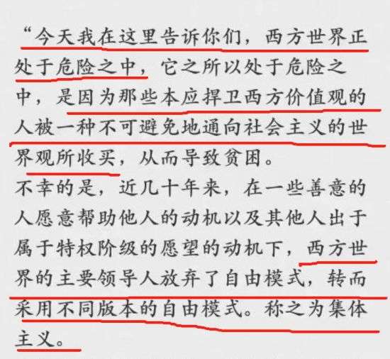 “西方世界的主要领导人,已经放弃了自由模式,转而采用了我们所称的集体主义的不同版本。”