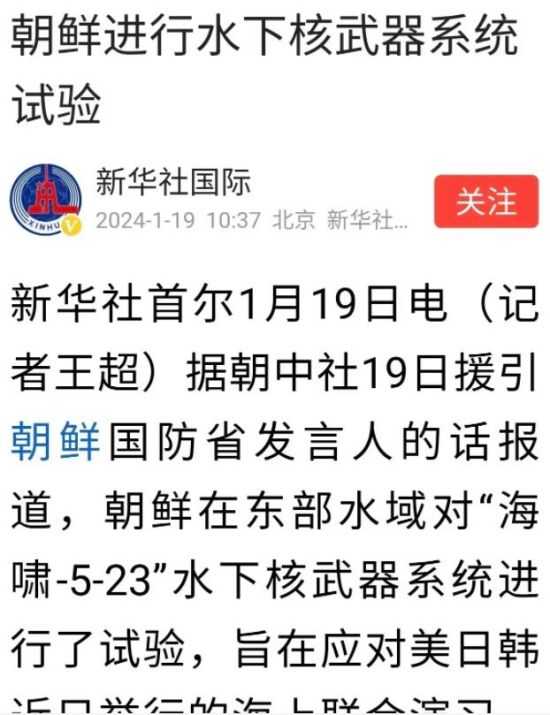 据朝中社1月19日援引朝鲜国防省发言人报道,朝鲜在东部海域进行“海啸-523”水下核武器系统实验。