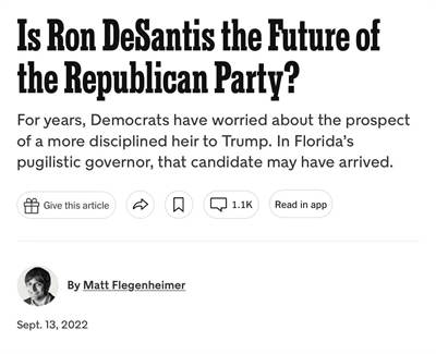 德桑蒂斯的与众不同之处在于,他暂时超越了克鲁兹(Ted Cruzes)、科顿(Tom Cotton)、蓬佩奥和彭斯等人,对共和党的现状和发展方向始终有核心的洞察力。有人说,德桑蒂斯的竞选纲领抓住了“特朗普主义”下选民最重视内容的最大公约数:对精英阶层的怒火?永远的怨恨?抑或是简单直接的个人吸引力?德桑蒂斯的解读是,找到值得效仿的信号特征然后加强它,这都是最基本的;而他的洞见是,“必须要投射出政治上的无畏,并以行政上的精确来粉碎对手”。