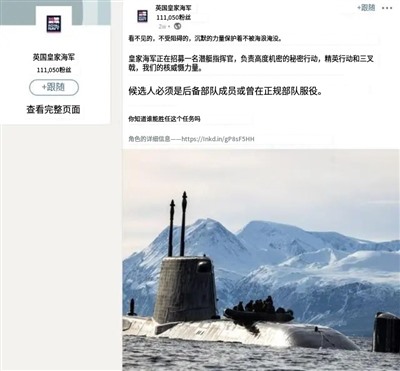 因此英国皇家海军在领英平台发广告招人这事不稀奇,在英国很正常,最近几年英国政府审批下来的用于皇家海军征兵广告的宣传费每年都在2000万英镑以上,为英国国家医疗体系护士招募花费的10倍以上,以吸引年轻人加入英国海军。