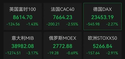 欧洲斯托克600指数下跌超2%,意大利富时MIB指数大跌3%,法国CAC40指数一度下跌3%。德国DAX指数、西班牙IBEX35指数均跌超2%。