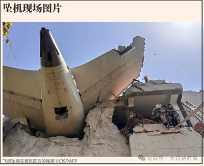 还有一张,据称是飞机坠毁在居民区后的尾部的照片。