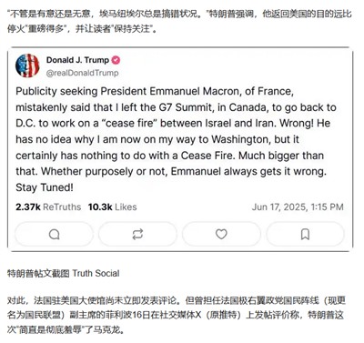 然而特朗普毫不留情地批评“一心想出名的法国总统马克龙误以为我离开加拿大的七国集团峰会,是为了回华盛顿推动以色列和伊朗之间的‘停火’。错了!”这种直接“打脸”的行为显然展示出特朗普对马克龙小丑行为的不耐烦。