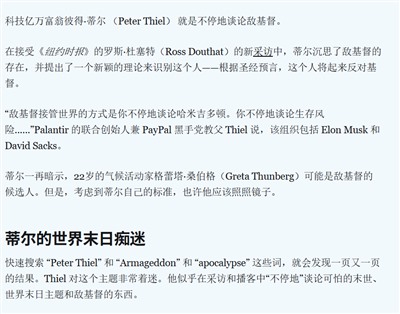 特朗普上台之后,彼得蒂尔的数据监视公司帕兰蒂尔市盈率达到了五百多倍,而最近还因为涉及监视美国人民数据隐私而饱受争议。再加上彼得蒂尔和他身边的新右翼,对基督教的态度十分微妙,比如曾经和齐泽克辩论的龙虾教授乔丹彼得森认为基督教是左派理论的来源。所以网友们狂喷彼得蒂尔才更像敌基督。保守主义哲学家曾经用这个词语批评理性主义的僭越,这回旋镖无疑是砸到了彼得蒂尔的脸上。对硅谷技术兄弟的讽刺没有比这更滑稽的了。