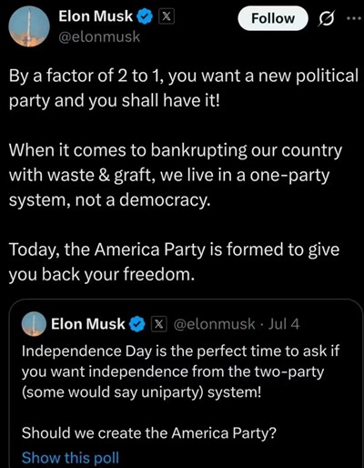 在大美丽法案通过后,马斯克真的宣布建党了。特朗普和马斯克二人不愧都是顶流网红,隔三差五就能变成全球焦点。从一开始的君臣相得光速走到独立建党这一步,世人对两人的印象和评价一再翻转。如今,一部分人又开始吹捧马斯克,认为他真的是一心为国,胸怀理想,锐意推动改革。