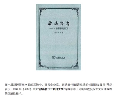 彼得蒂尔采访中使用的“敌基督”比喻更是自相矛盾到被美国网友群嘲。他认为当下技术进步停滞的根本原因就是管的太多,各种监控当然是管得太多的表现形式,人们因为担心变革力量的破坏力,所以愿意被管,自然就没有了技术创新。而管的太多了,监视技术就会进步。最后,人类社会对技术变革的担心会创造出一个“用各种技术建造的监视社会”,这就是敌基督。
