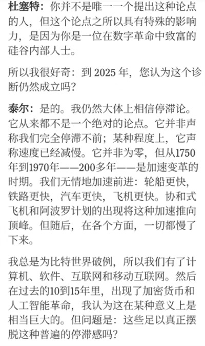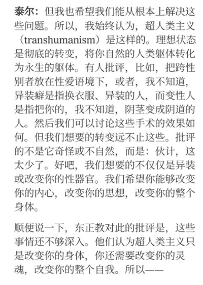 这次彼得蒂尔的采访有助于我们更清楚地理解这些硅谷技术右翼的想法。除了关于马斯克的部分,主要内容是彼得蒂尔对于当下世界的观点。他认为当下面临的各种困境是因为人类社会的技术发展面临停滞,所以才会有各种问题。比如马斯克的火箭最近发射爆炸,比如说他觉得人工智能技术还不错,但是远远不能解决停滞的问题。