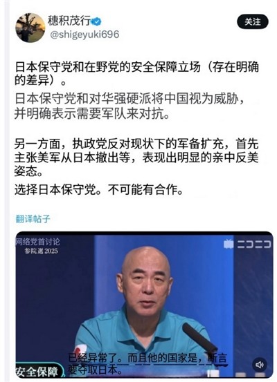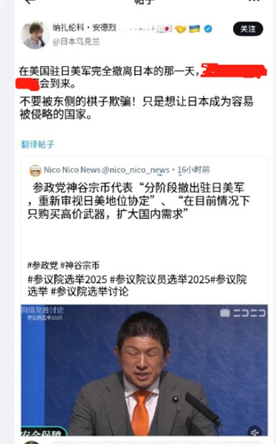 举个新鲜例子,这几天日本参政党代表神谷宗币发表了“美军应该逐步撤出日本,并重新审查日美地位协定”的言论。本来作为这两年迅速崛起的,主张“日本优先”的右翼政党,参政党无非是欧美这几年愈发流行的本土保守民粹右翼同类,各种主张在民粹政治流行的当下平平无奇。但日本人就很奇葩了,这番主张美军撤出的言论被日本人认为是“日奸”、“亲中”。