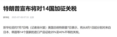 因为就在今天,川普还同时宣布了,将从8月1日起分别对来自日本、韩国等14个国家的进口产品征收25%至40%不等的关税。