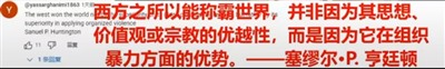有人引用美国当代政治思想家、国际政治理论家萨缪尔·P·亨廷顿(Samuel P. Huntington)的话说:“西方之所以能称霸世界,并非因为其思想、价值观或宗教的优越性,而是因为它在组织暴力方面的优势。”