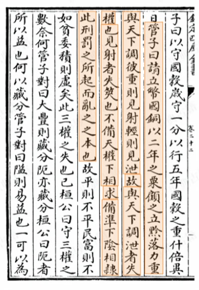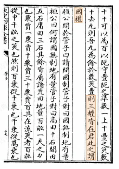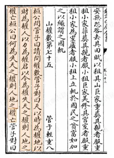 “桓公问管子曰:「请问权数。」管子对曰:「天以时为权,地以财为权,人以力为权,君以令为权。失天之权,则人地之权亡。」……管子曰:「请立币。国铜以二年之粟顾之,立黔落。力重与天下调。彼重则见射,轻则见泄,故与天下调。泄者,失权也。见射者,失策也。不备天权,下相求备准,下阴相隶,此刑罚之所起,而乱之之本也。