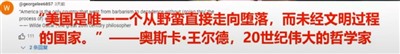 有人引用西方20世纪伟大哲学家奥斯卡·王尔德(Oscar Wilde)的话说:“美国是唯一一个从野蛮走向堕落,而未经文明过程的国家。”
