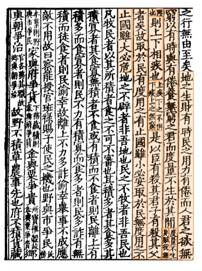 “地之生财有时,民之用力有倦,而人君之欲无穷。以有时与有倦养无穷之君,而度量不生于其闲,度量不生,则赋役无限也。则上下相疾也。上疾下之不供,下疾上之无穷。是以臣有杀其君,子有杀其父者矣。故取于民有度,用之有止,国虽小必安;取于民无度,用之不止,国虽大必危。”