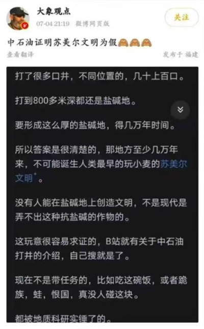 三桶油之一的中石油也以地质学事实和实践操作证明了苏美尔文明属于伪史范畴。