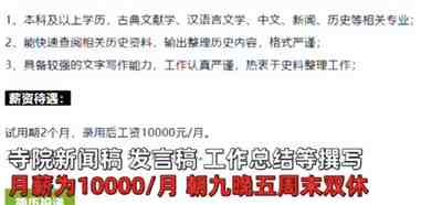 还记得这个月初,位于浙江湖州的法华寺曾发布过一则招聘启事:一份资料员的工作,月薪上万,工作时间呢,还是朝九晚五,周末双休。