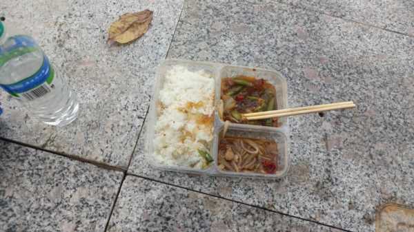 我注意到了一个吃饭的细节。当时是包饭的,午餐是一盒米饭和两个菜,菜基本上是素的,我记得一份菜是土豆丝,另一份是西葫芦,里面有粉丝,还有一点点肉。工友们都很累,但是他们都没有吃完。他们主要还就是馒头就水喝,很多人菜都没有吃完,米饭也没有吃,就把那个盒饭扔掉了。这个很有意思。我自己把饭和菜都吃完了。