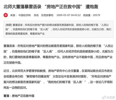 2009年,董藩那句“所有反对房地产复兴的想法都是危害国家利益”,雷倒过不少网友。彼时,董教授还获得了“人民公敌”、“开发商走狗”的称号。