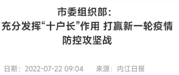 “十户长”,顾名思义,十户设立一个“户长”,作用自然是为了防疫管理。有事没事敲敲门,入入户,到你家里看看有没有消杀,有没有做核酸,有没有戴口罩之类。