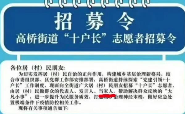 除此之外,我发现这个“招募令”还是街道、社区发布的,本身就是一个小吏,你们有什么资格这样做?你们凭什么在一个街道内继续设立权力机构,招募这所谓的“十户长”?招募到了人你们有组织机构代码证吗?老百姓为什么要接受“十夫长“的管教?我特么写小说都没有你们这么自由,都会考虑一下法律。公然招募“十户长”的街道、居委,你们眼里还有没有法律的存在?