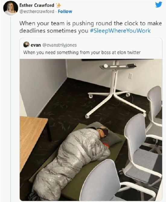 但话再说回来,资本主义本就不是灵丹妙药,况且现在已经到了“内爆阶段”。比如推特之前有位女性产品总监晚上加班,睡在单位里,很“狼性”: