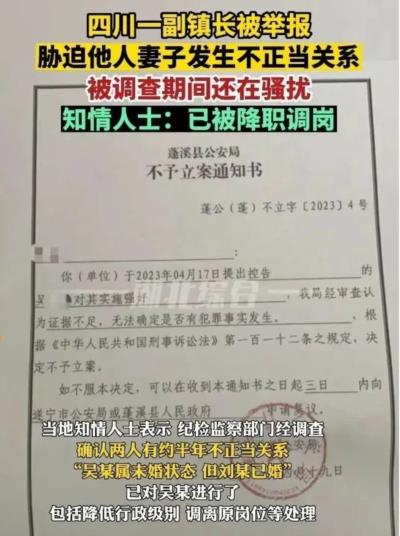 2023年4月16日,蓬溪县公安局针对人妻刘某对副镇长强奸的控告,因现有证据不足,作出了不予立案通知书。