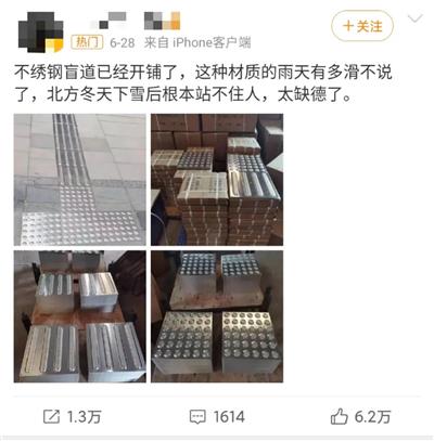 6月28日,一位博主发布了一条关于广东某地开铺不锈钢盲道的微博,唤起了人们对于盲道的古早记忆,也掀起了又一轮大众对于盲道的剧烈吐槽。