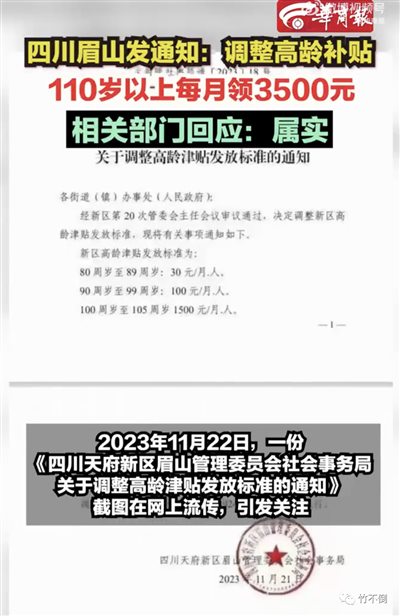 地铁上随意刷刷新闻,看到这样一条,眉山110岁以上老人每月可领3500元。