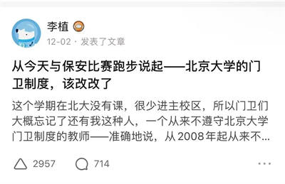 随着北京大学工学院副教授李植有关进出北大校门的文章在网络社交媒体上广为流传,“大学校园该不该开放”的话题近几日再度成为社会舆论热议的话题。