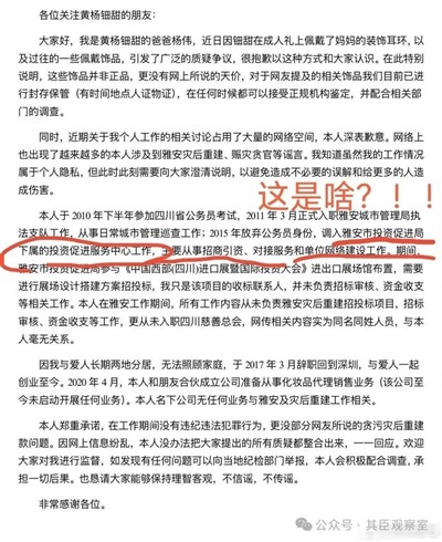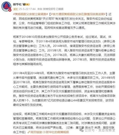 第二,官方通报中明确说,杨某于2014年9月,借调至雅安投资促进局工作,2015年1月调入雅安市投资促进局下属科级事业单位投资促进局服务中心工作。是不是任服务中心主任?通报中没有说。