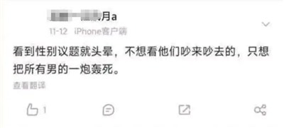 当然有人说这是普通吐槽、发泄。行,我尊重,毁灭世界、轰掉所有男性,这只是普通正常吐槽,行。我再提个车速,lsp应该都喜欢上推、管吧?推上我经常看到国内一些在内部体系中,女的在上面发一些毁你三观的图。