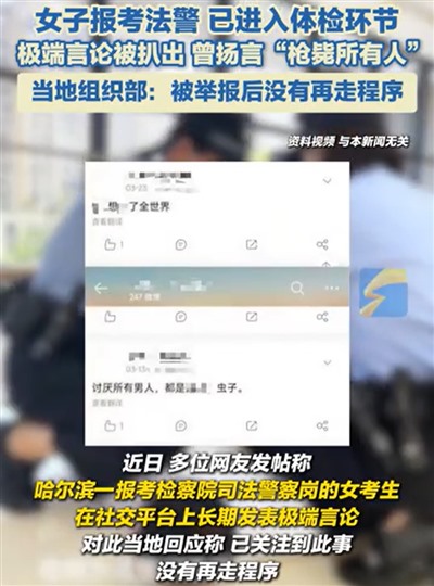 怕是未必。你比方说前阵子爆出来,说是哈尔滨一女子报法考,都进入体检环节了,结果被扒出来有极端言论: