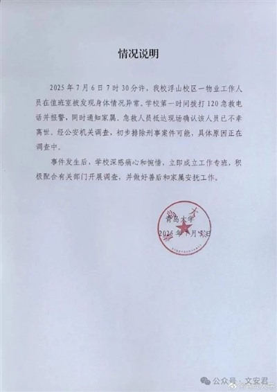 青岛大学上了舆论风口。青岛最近高温。2025年7月6日,青岛大学浮山校区一名宿管人员在值班室(无空调、仅风扇),被发现身体异常后离世,同日另有学生中暑送医。当日青岛气温超40℃,值班室实测达43.2℃。