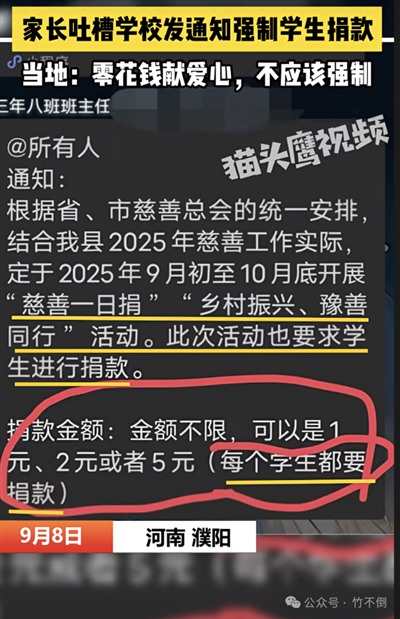 可能这就是频频导致教育方面出问题上热搜的原因之一吧。今天河南某地还有一所学校的家长吐槽说学校发通知强制学生捐款,要求学生用“零花钱献爱心”。实在让人看了直摇头,从小培养孩子的“善良”。呵呵,倘若这是有必要的,我瞧着某些人这辈子是善不起来了,毕竟他们没有从小被培养,相反现在还不断锻炼处处为恶行径。