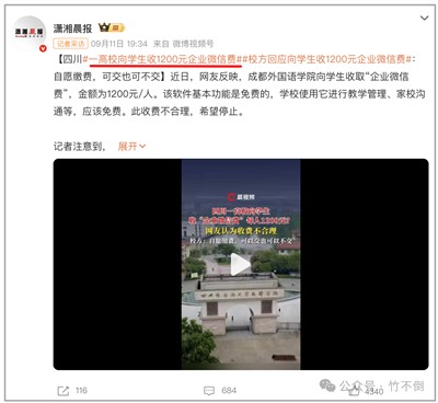 四川一高校向学生收1200元每个人的“企业微信费”。