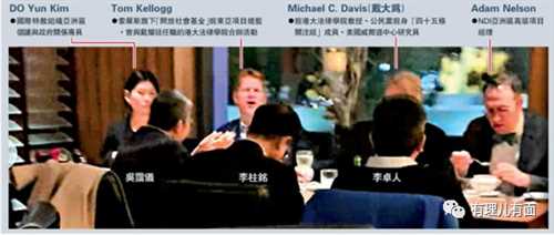 此人应为美国国际事务民主协会(NDI)国际特赦组织亚洲区倡议与政府关系专员。2019年12月,我国外交部宣布制裁美国国际事务民主协会(NDI)等多个反中乱港非政府组织后,NDI亚洲区高级项目经理Adam Nelson随即抵港与李柱铭、李卓人等反对派头目密会,策动区选后行动方向,当时金度允(上图中,后排左一)就在场。