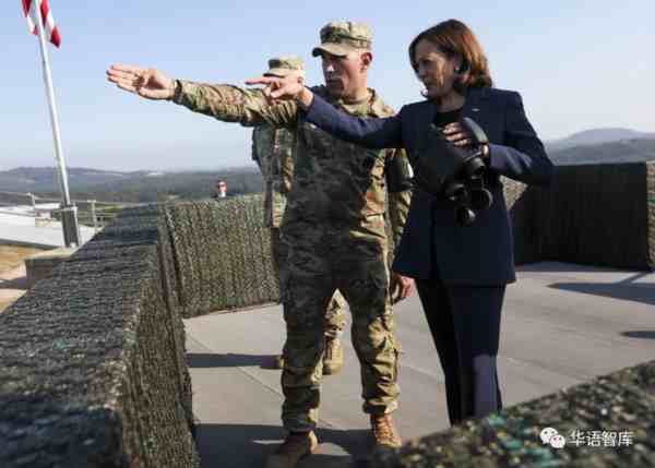 2022 年 9 月 29 日,美国副总统卡马拉哈里斯(右)在韩国板门店视察分隔两个朝鲜的非军事区时在军事观察哨使用双筒望远镜。(Leah Millis/美联社)