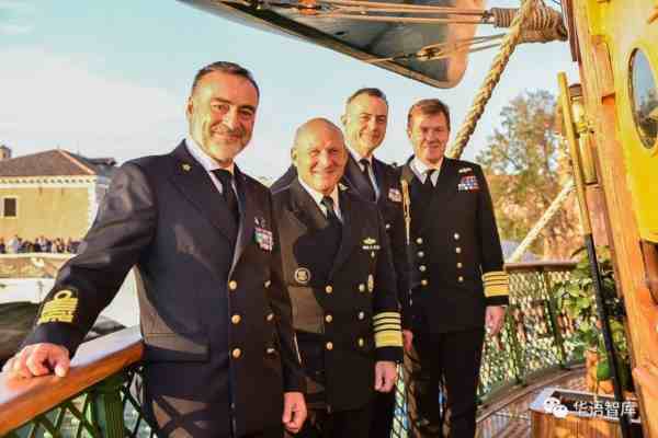 海军作战部长迈克·吉尔戴上将(左二);法国海军司令皮埃尔·范迪埃上将(右二);意大利海军上将 Enrico Credendino(左);2022 年 10 月 6 日,在意大利海军主办的第 13 届跨区域海权研讨会 (TRSS) 上,皇家海军第一海务大臣本·基 (右) 在意大利海军训练舰 ITS Amerigo Vespucci 上合影留念. (Cmdr. Courtney Hillson/美国海军)