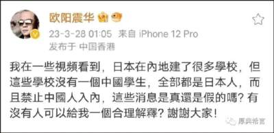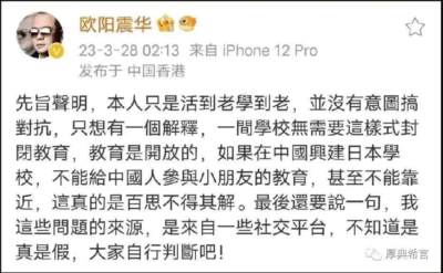 2023年,3月28日凌晨,61岁的中国香港演员欧阳震华在社交平台,再次发起了关于在华日本人学校话题的讨论,欧阳震华发文质疑: