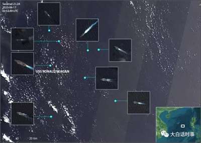 然后6月17日,网络上流传一张图,显示里根号航母被多艘船只“包饺子”。