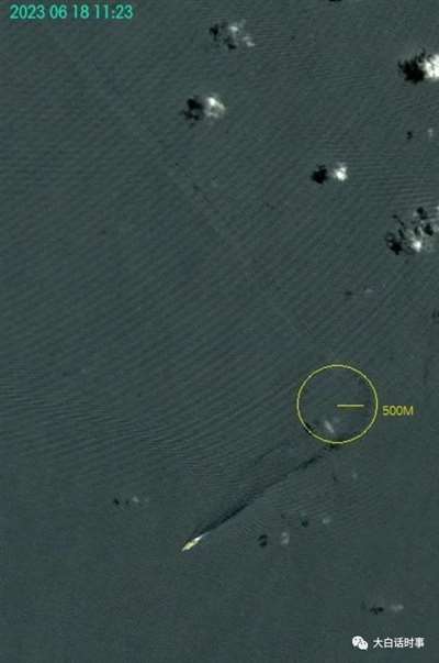 6月18日,网络上又有一张图片流出,图里显示,里根号航母突然进行了90度急转弯,转弯半径500米,而里根号航母舰长332米。