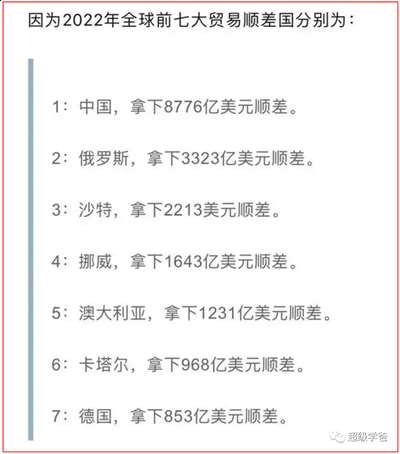 数据显示,2022年的顺差最大的国家,分别是中国(8776亿美元),俄罗斯(3323亿美元)、沙特(2213亿美元)、挪威(1643亿美元)、澳大利亚(1231亿美元)、卡塔尔(986亿美元)。