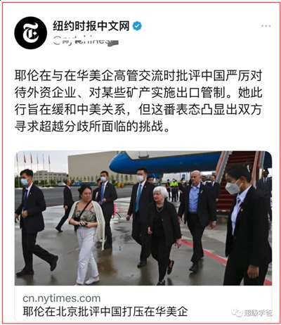 在耶伦访华之际,纽约时报声称,耶伦面临的挑战是让中方官员相信,美国以国家安全名义阻止中国获得半导体等敏感技术的一系列措施,并不是为了损害中国经济。