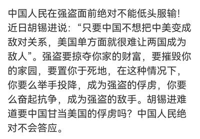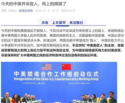 今天的中国和美国彼此不是敌人,今后也决不应该成为传统意义上的敌人,老胡相信这是中美两国大多数人的共同意愿。美国在搞霸权主义,试图遏制中国发展,中国必须与它的这个图谋开展坚决斗争。即使这样,两国也都不希望成为“敌人”,中国在致力于以斗争谋和平共存及合作。就中国互联网舆论来说,不应烘托“中美是敌人”的主张,或者说需要有强大的网上舆论力量平衡这种激进主张,为中国实施稳健而有力的对美政策,尽量保持和扩大中美两国之间的经济和各种交流创造有利的舆论环境(《今天的中美并非敌人,网上别搞错了》胡锡进 胡锡进观察 2024-01-31)。