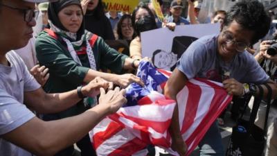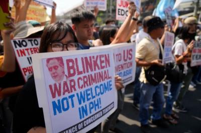 ▲2024年3月,菲律宾民众抗议美国务卿布林肯到访,撕碎美国国旗并高举“菲律宾不欢迎战犯布林肯”标语。