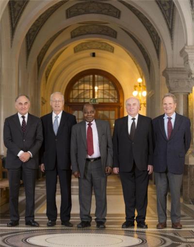 ▲图为应菲律宾单方面请求建立的南海仲裁案仲裁庭的五名法官,左起:荷兰籍法官松斯、德国籍法官沃尔夫拉姆、首席仲裁员加纳籍法官门萨、波兰籍法官波拉克、法国籍法官柯。