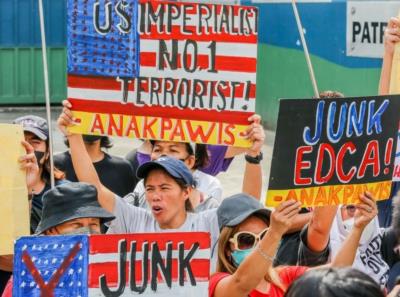 ▲2023年4月,在菲律宾首都大马尼拉地区奎松城,民众参加集会活动,抗议菲律宾和美国军方举行联合军事演习。