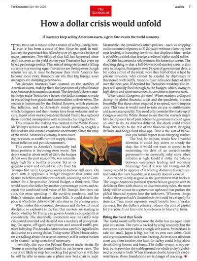 特朗普关税战的部分受挫,不足以改变他改造布雷顿森林体系,克服“特里芬悖论”的决心,因此他很可能下一步重点转向金融战。在“海湖庄园协议”的设计中,关税本来就主要是谈判手段,“对等关税”的数值并非关键。但4月2日特朗普宣布“解放日”后,出现了一个他没有意料到情况,即国债市场的波动导致市场对美元的储值功能的信心下降。正如2025年4月19日英国“经济学家”杂志报道: