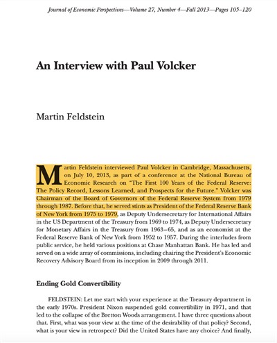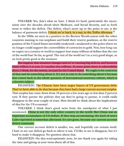 关于特朗普关税战和金融战的关系,他新任命的总统经济顾问委员会主席Stephen Miran在所谓“海湖庄园协议”里已经做了系统的论述。“海湖庄园协议”的关键是关税,美元和对同盟国的“安全保护伞”的“三位一体”,其主旨是改造布雷顿森林体系,克服“特里芬悖论” (参见第564期|崔之元:Stephen Miran与“海湖庄园协议”)。美联储前主席沃克尔在2013年接受Miran的哈佛导师Martin Feldstein的访问时认为,1971年尼克松使美元与黄金脱钩后,“特里芬悖论”仍然存在,只是美元和黄金挂钩在美国巨大贸易逆差下的不可持续性转化为美国国库券的价值稳定和各国对美顺差(中国首当其冲)所积累的巨额美元之间的不可持续性。