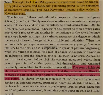 实际上,华为的员工持股制度 (任正非本人至今只占华为总股份的1.4%)是在“初次分配”上也兼顾效率与公平的“共同富裕”的成功案例(详细情况可参见“玖零管理研究院”微信公号以及“华为年报 2019”)在“初次分配”上兼顾效率与公平,使得劳动者能够分享企业生产率提高带来的利润增长,是“扩大内需”的关键。当然,我所说的“华为模式普遍化”,并不是说所有企业都必须采用华为的员工持股制度,而是要借鉴华为模式的精神,也即是“十二五规划”(2010年)中已经提出的“劳动报酬增长和劳动生产率提高同步”。其实,“福特生产方式”的发明者亨利·福特在1914年已经把福特公司工人的工资提高到每天5美元,这是当时行业平均工资的两倍,他说这样才能使得福特汽车公司的工人买得起他们生产的Model T 汽车。在“后福特主义”的经典著作“第二次工业分水岭”中,Michael Piore和Charles Sabel进一步论述了通用汽车公司(GM)和汽车工人联合会(UAW)的工资增长和生产率增长挂钩的合约的重要性,认为这是在“非凯恩斯国家”的美国实行了“凯恩斯式收入政策”: